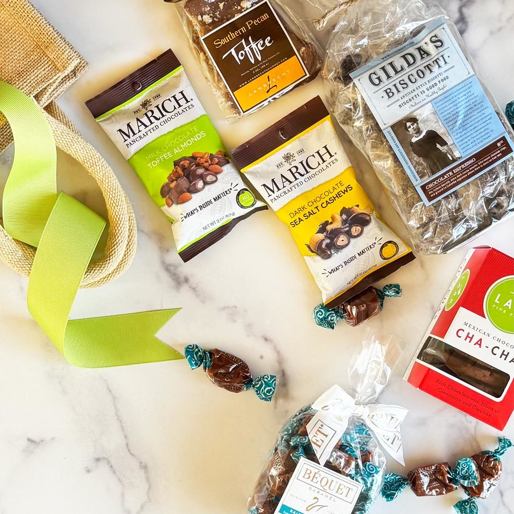 Begin this chocolate explosion with the irresistible Dark Chocolate Sea Salt Cashews from Marich Confectionery. Fresh whole roasted cashews are layered in premium rich dark chocolate with a hint of sea salt for the perfect salty chocolate crunch. No chocolate gift would be complete without one of our favorites: Lambrecht Gourmet's Southern Pecan Toffee, featuring plump roasted pecan halves covered in rich butter toffee, then drenched in creamy Belgian milk chocolate. Smooth, award-winning Béquet Caramels are widely recognized as some of the best caramels in the country, and their handmade Salted Chocolate Caramels provide a sprinkle of salt for an exquisite sweet/salty satisfaction. More rich chocolaty goodness is found in Marich Confectionery's Milk Chocolate Toffee Almonds. Fresh roasted whole California almonds are glazed with buttery sweet toffee and covered in creamy milk chocolate for a delicious anytime indulgence. Savor a piece of Chocolate Espresso Biscotti from Gilda's Biscotti —as welcomed for breakfast as it is for afternoon tea. Finish with a Mexican Chocolate Cha Cha from Lark Fine Foods. Reminiscent of a Mexican Brownie, this award-winning cookie features rich chocolate with hints of cinnamon and cayenne for a delightfully toasty experience. Presented in our signature jute tote and perfect for any occasion. This gift is what chocolate dreams are made of.