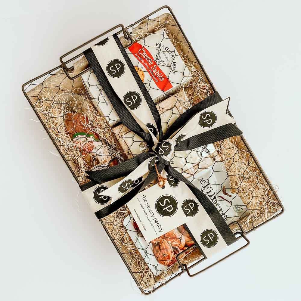 Happy hour enthusiasts will thrill at this collection of snacks to balance the booze. Rely on our selection of the best in artisan olives, crackers, charcuterie, and more, piled high in a canvas-lined wire basket.