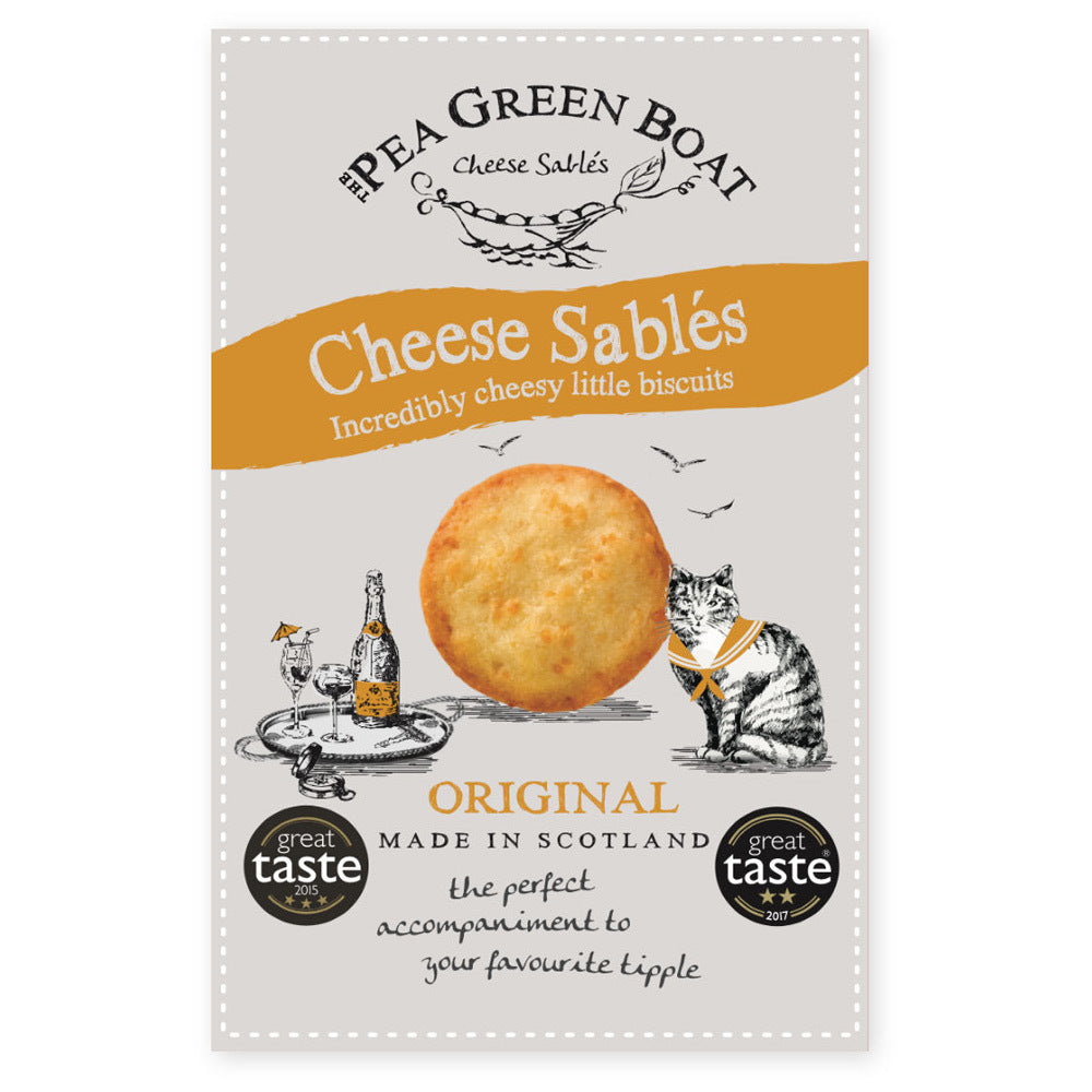 - Pea Green Boat - Cheese Sables: These exceptionally cheesy morsels are made in Scotland from best quality ingredients. Enjoy with a martini or a glass of wine. 2.8 oz box
