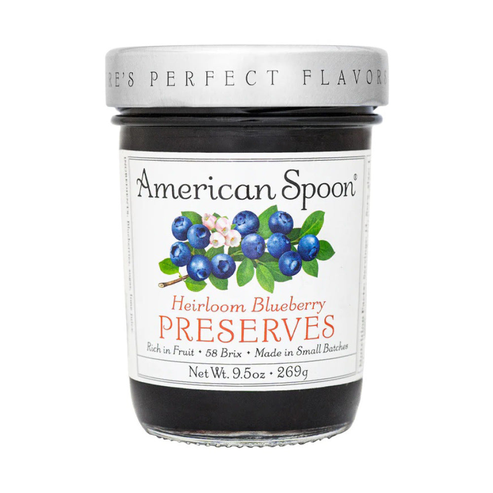 - American Spoon - Heirloom Blueberry Preserves: An intensely flavored jam, thick with small Rubel Blueberries grown along the Lake Michigan shore. Deep , jammy flavor will enhance your morning baked goods. 9.5 oz.
