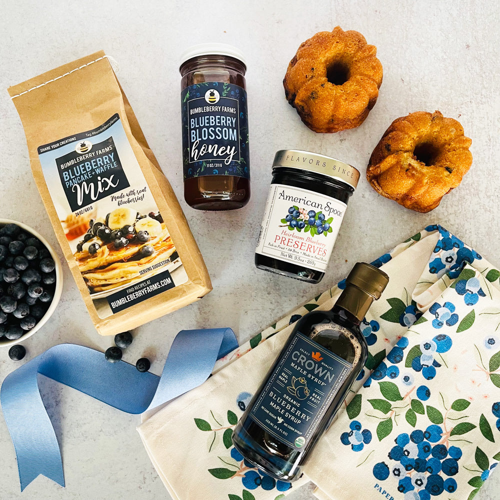 The versatile and flavorful blueberry takes center stage in this carefully curated breakfast gift, sure to delight. Bumbleberry Farms Blueberry Pancake & Waffle Mix is made with select wild blueberries and sweet cream buttermilk and produces light and fluffy pancakes every time. Bathe them in brightly flavored organic blueberry syrup, full of flavor and healthy antioxidants. If toast is your morning favorite, treat it (and yourself) to Heirloom Blueberry Preserves atop. Sweet and intensely flavorful with just the right amount of sugar and a splash of lemon, this jam is also good on pancakes, or the J of an extra special PB&J. Blueberry Blossom Honey is a deep, rich sweetener for your morning tea, yogurt or oatmeal. Enjoy your morning coffee with individually portioned Blueberry Coffee Cakes, featuring New England Blueberries blended into a traditional rich sour cream coffee cake batter. A pretty, practical blueberry tea towel will be a welcome addition to any kitchen.