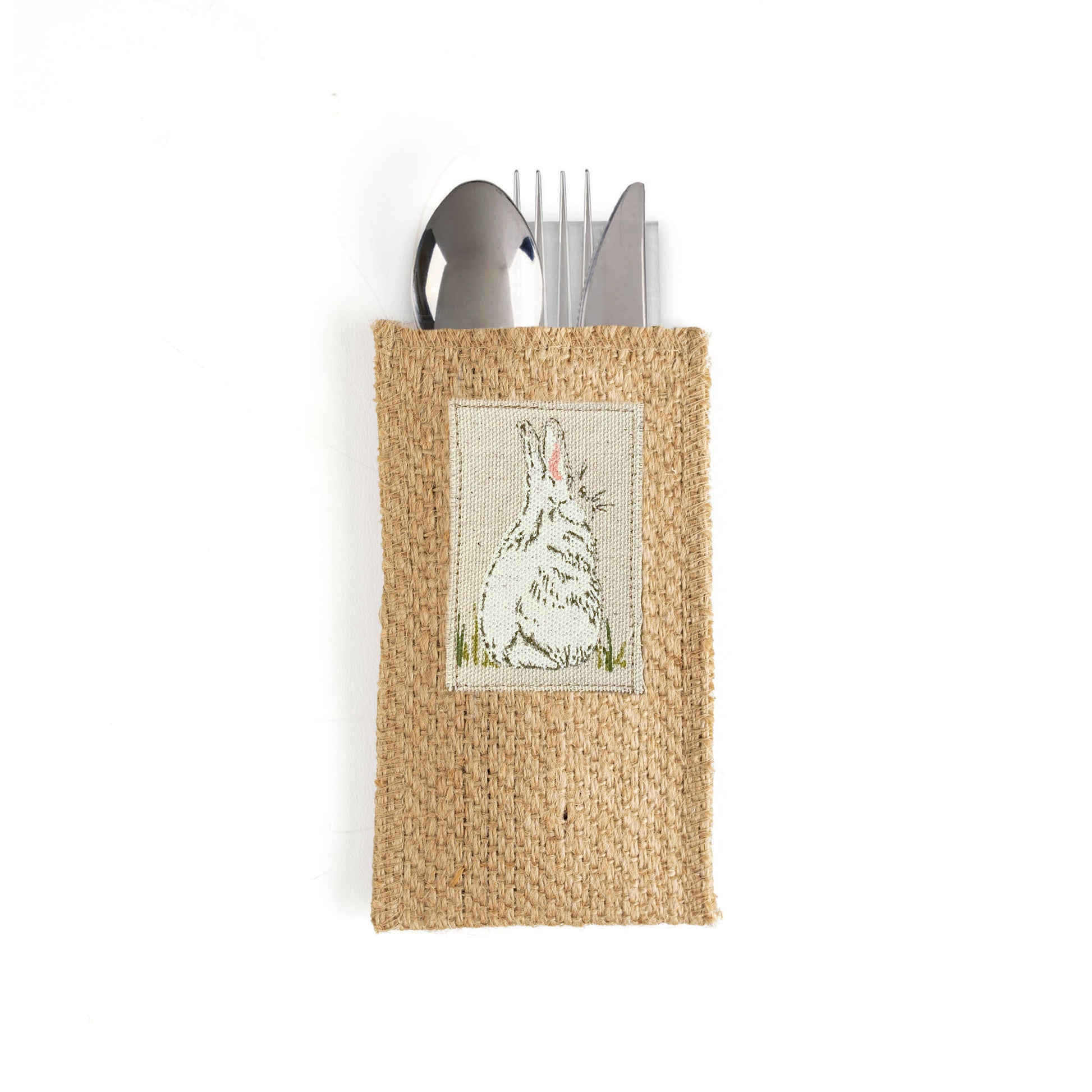 This charming bunny silverware pouch set adds a sweet, subtle touch to your spring table. Featuring a delicate line drawing on natural woven jute, these reusable pouches are perfect for Easter brunch, dinner, and seasonal gatherings year after year. Set includes eight jute silverware pouches, each screen-printed on a canvas patch and packaged in a reusable muslin storage bag. Natural variations in color and weave are part of the charm.