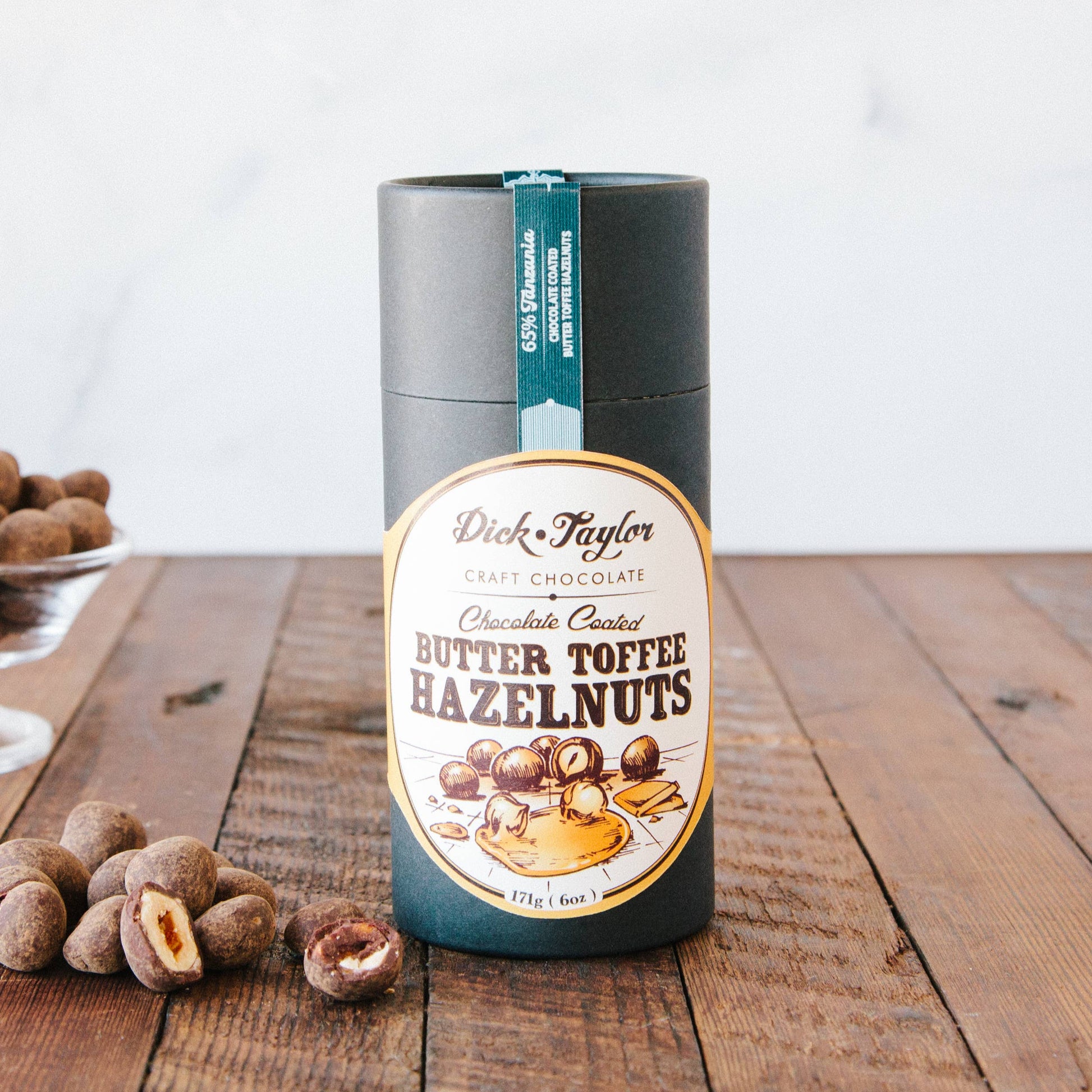 Internationally recognized as one of the world's leading chocolatiers, Dick Taylor has once again struck gold with their newest offering. Treat yourself to these crunchy roasted hazelnuts delicately coated in buttery toffee and finished with a generous layer of 65% Tanzania Dark Chocolate. An irresistible blend of richly decadent sweetness and nutty crunch. A sumptuously indulgent treat for yourself, but beautifully packaged to make gifting a breeze. Made in California from single origin bean to bar chocolate. Gluten free and non-GMO.