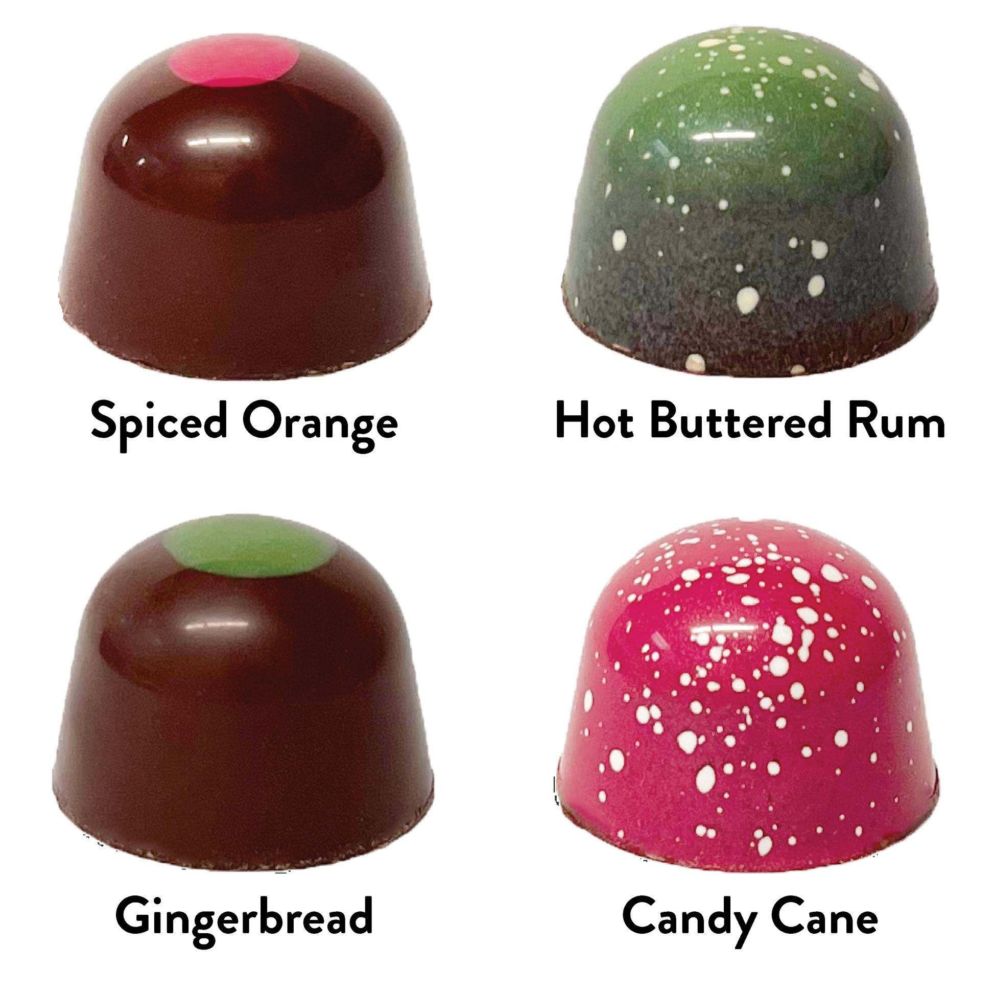 - Gingerbread: A festive celebration of one of the most iconic holiday flavors. Notes of molasses, cinnamon, clove, and ginger enrobed in chocolate reveal the perfect balance in every bite.